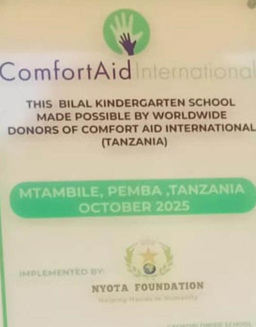 The Bilal Kindergarten School in Pemba, Tanzania, sponsored by donors of Comfort Aid International (USA), was officially opened on October 13, 2025. This much-needed, currently nonexistent early childhood learning center will provide a platform for young children to get a head start in their elementary education.